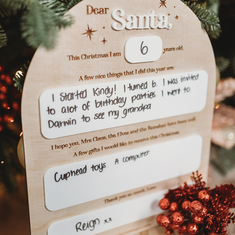 Our dear Santa plaque is a sweet tradition for your kids to enjoy and a great way to reflect on the year past and teaching them what Christmas is all about by sharing their good deeds and Santa also gets an idea of what he could bring for Christmas. Simply fill in the plaque with the included white board marker and snap a photo so that you can watch them grow through the years.