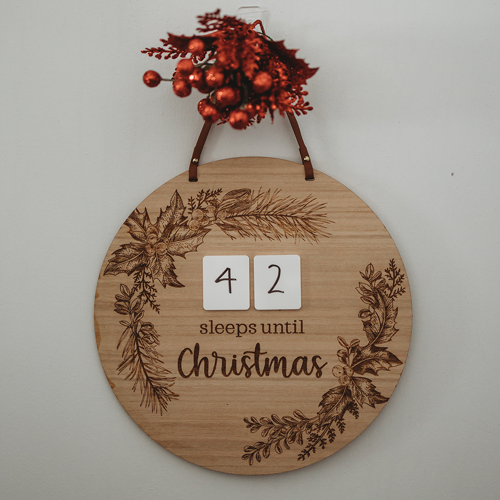 Add some magic this December with our Christmas wreath count down plaque Use the provided white board marker and lens cloth to write and wipe off the number of sleeps until the big man in red comes on the white acrylic